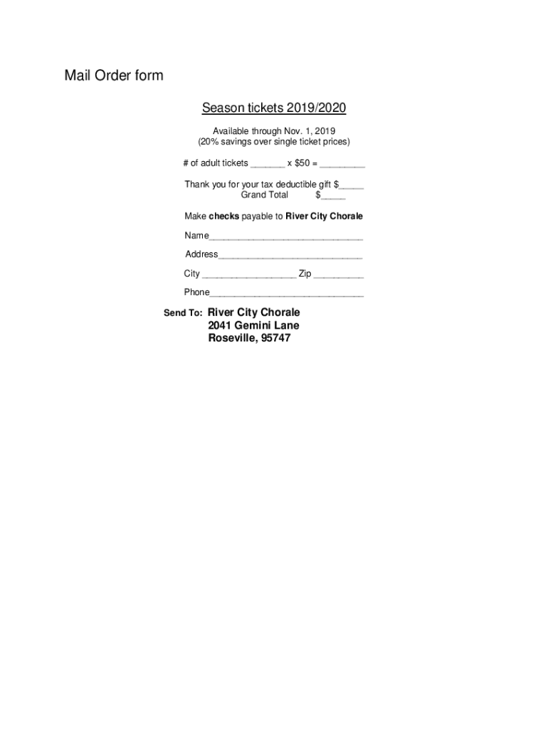 Mail Order form Season tickets 2019/2020 Available through Nov. 1, 2019 (20% savings over single ticket prices) # of adult tickets x $50 Thank you for your tax-deductible gift $ Grand Total $ Make
