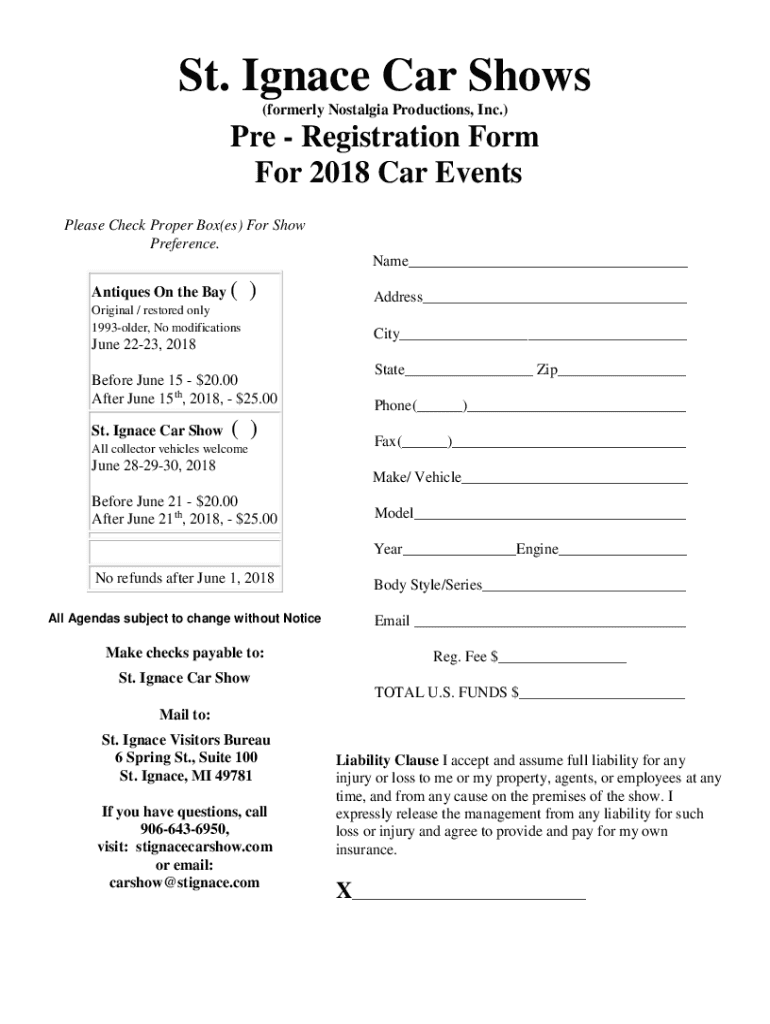 Participants and exhibitors who wish to display their vehicles or have a booth at the St. Ignace Car Shows are typically required to file registration forms.