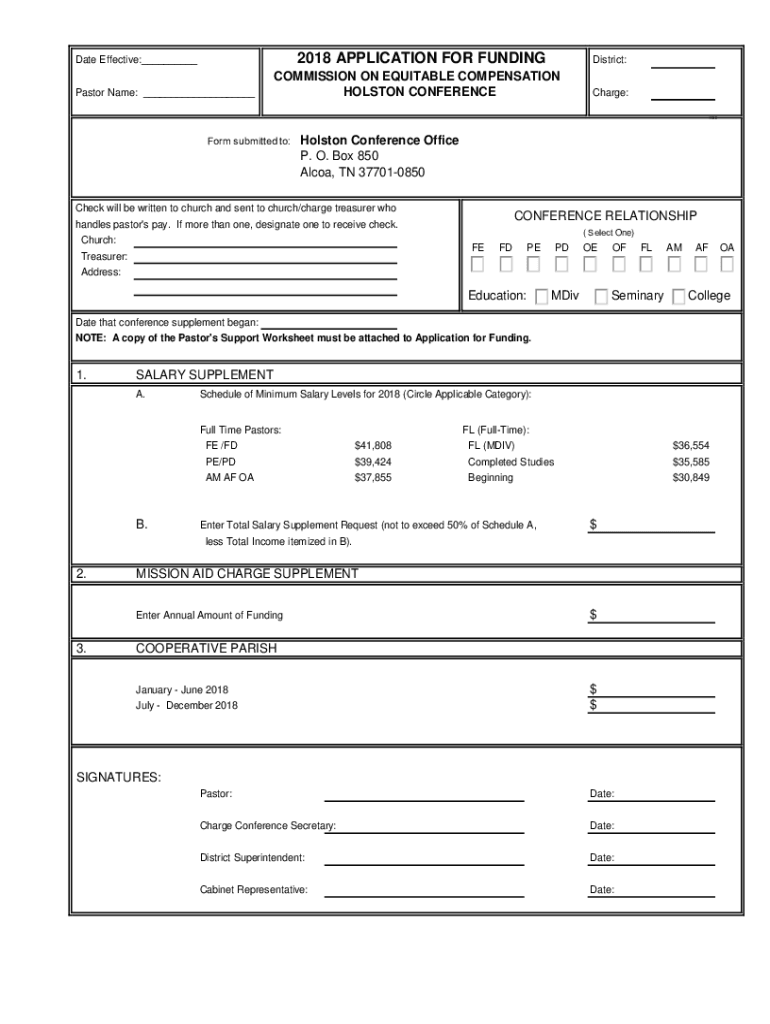 2018 APPLICATION FOR FUNDINGDate Effective: Pastor Name: District:COMMISSION ON EQUITABLE COMPENSATION HOUSTON CONFERENCEForm submitted to:Charge:Houston Conference Office P. O. Box 850 Alcoa, TN