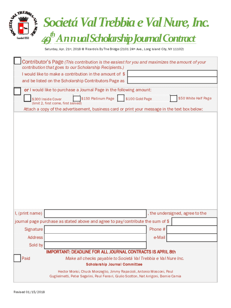 SocietValTrebbiaeValNure, Inc.49thAnnualScholarshipJournalContract Saturday, Apr. 21st, 2018 Ricardo's By The Bridge (2101 24th Ave., Long Island City, NY 11102)Contributors Page (This contribution