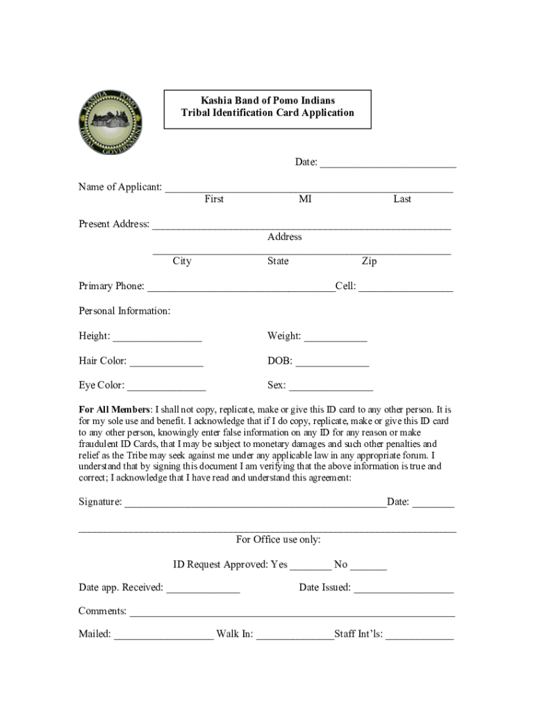 Keisha Band of Polo Indians Tribal Identification Card ApplicationDate: Name of Applicant: First MI Last Present Address: Address City State Zip Primary Phone: Cell: Personal Information: Height: