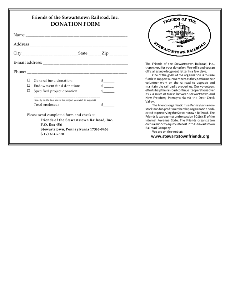 Get the free Friends of the Stewartstown Railroad, Inc. DONATION FORM
