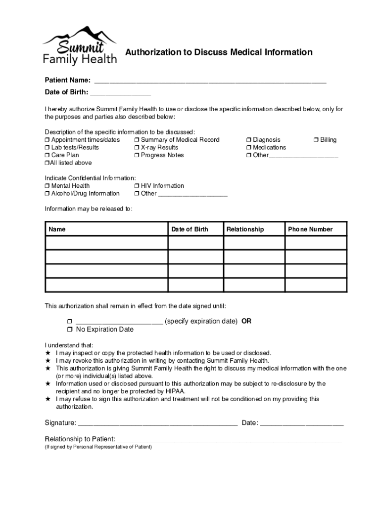 Authorization to Discuss Medical Information Patient Name: Date of Birth: I hereby authorize Summit Family Health to use or disclose the specific information described below, only for the purposes
