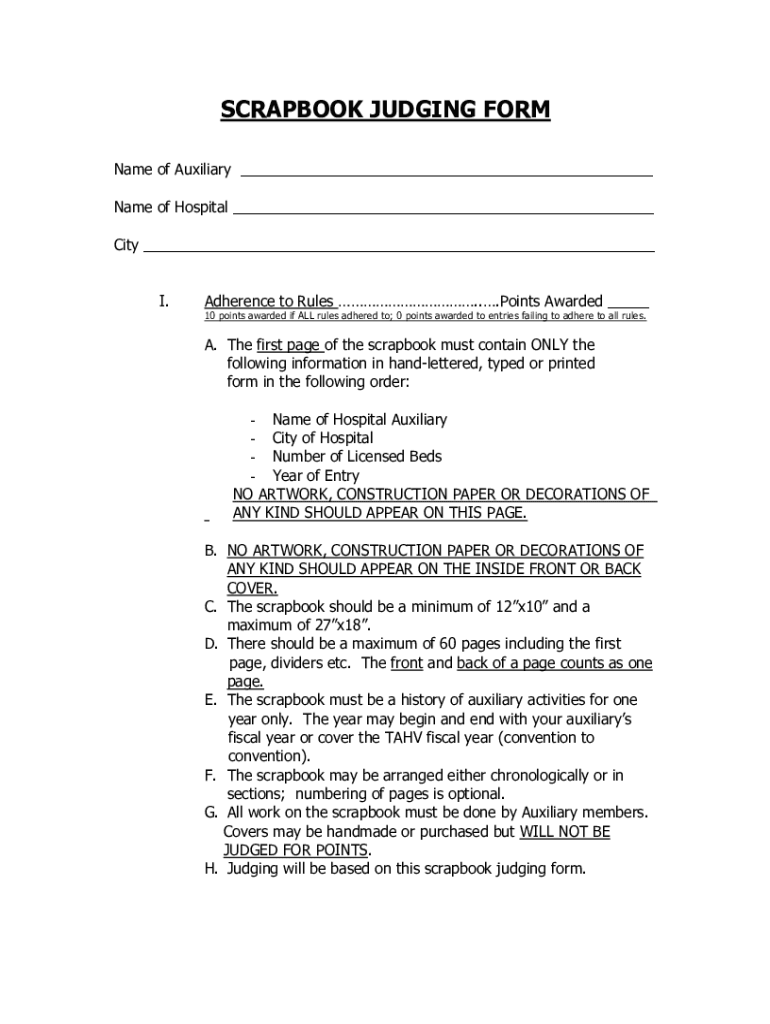 SCRAPBOOK JUDGING FORM Name of Auxiliary Name of Hospital City I. Adherence to Rules ... Points Awarded 10 points awarded if ALL rules adhered to; 0 points awarded to entries failing to adhere to