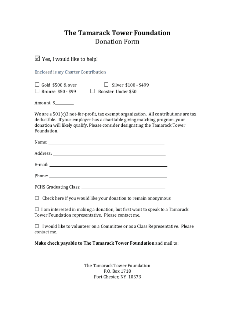 The Tamarack Tower Foundation Donation Form Yes, I would like to help! Enclosed is my Charter Contribution Gold $500 & over Bronze $$5099 Silver $$100499 Booster Under $50Amount: $ We are a 501(c)3