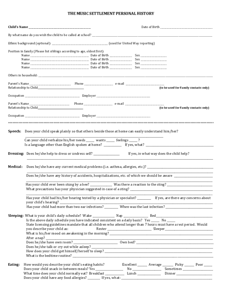 THE MUSIC SETTLEMENT PERSONAL HISTORY Child's Name Date of Birth By what name do you wish the child to be called at school? Ethnic background (optional): (used for United Way reporting) Position in