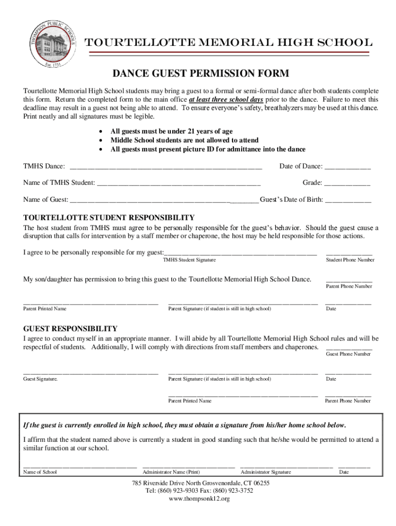 Tourtellotte Memorial High School DANCE GUEST PERMISSION FORM Tourtellotte Memorial High School students may bring a guest to a formal or semiformal dance after both students complete this form. Return