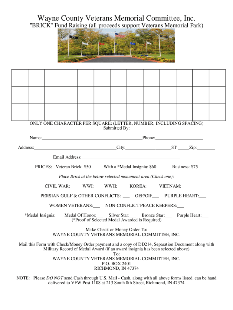 Wayne County Veterans Memorial Committee, Inc. “BRICK Fund Raising (all proceeds support Veterans Memorial Park)ONLY ONE CHARACTER PER SQUARE: (LETTER, NUMBER, INCLUDING SPACING) Submitted By: Name: