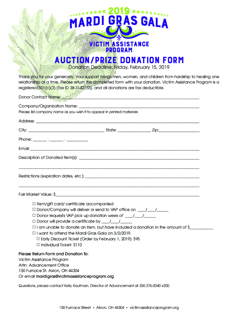 Auction/Prize Donation Form Donation Deadline: Friday, February 15, 2019Thank you for your generosity. Your support brings men, women, and children from hardship to healing one relationship at a time.