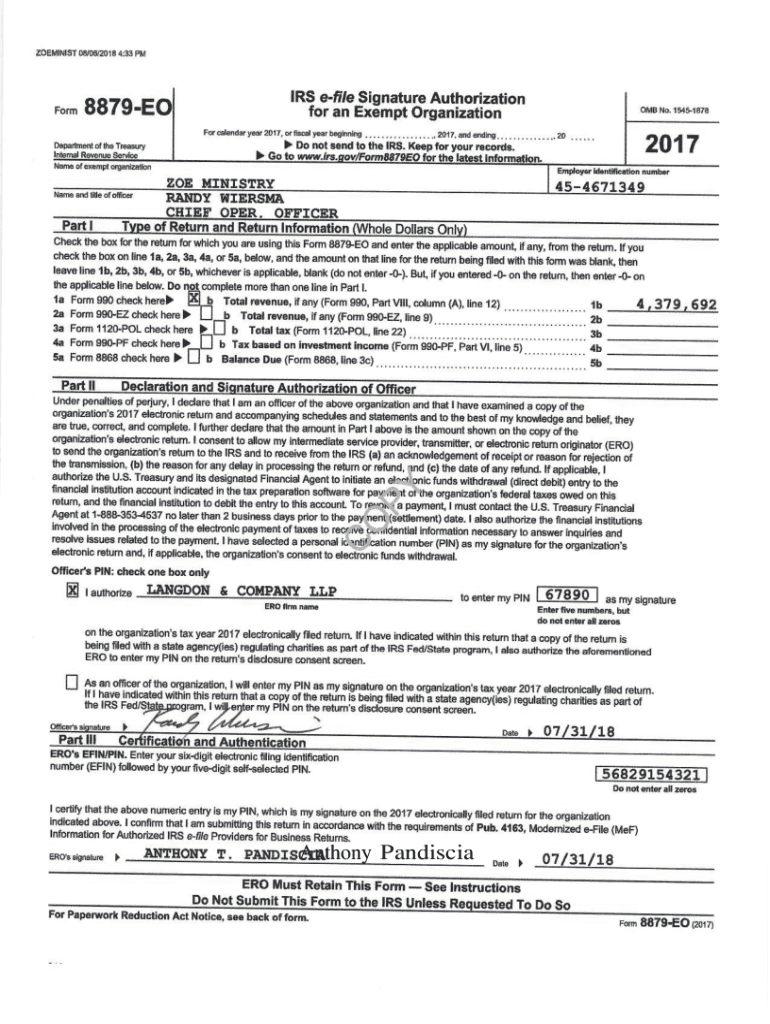 Anthony PandisciaZOEMINIST 08/09/2018 10:07 AM990FormReturn of Organization Exempt From Income Department of the Treasury
