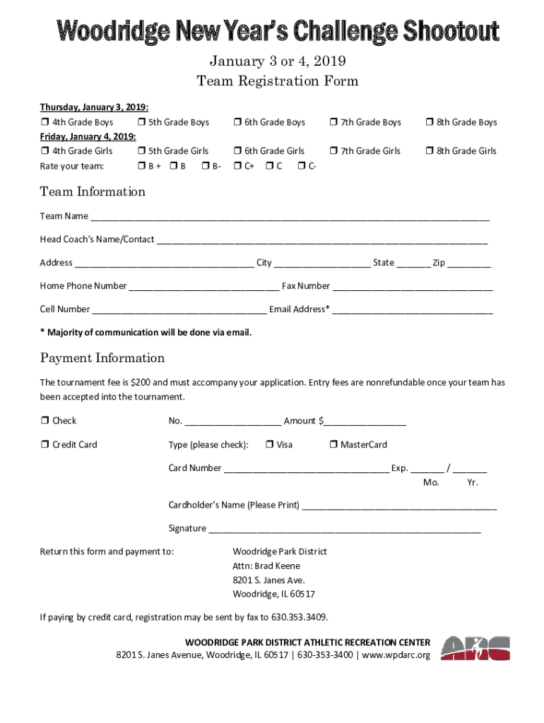 Woodridge New Years Challenge Shootout January 3 or 4, 2019 Team Registration Form Thursday, January 3, 2019: 4th Grade Boys 5th Grade Boys Friday, January 4, 2019: 4th Grade Girls 5th Grade Girls