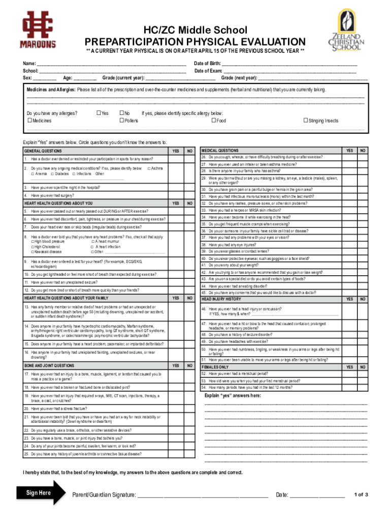 HC/ZC Middle School PARTICIPATION PHYSICAL EVALUATION ** A CURRENT YEAR PHYSICAL IS ON OR AFTER APRIL 15 OF THE PREVIOUS SCHOOL YEAR **Name: Date of Birth: School: Date of Exam: Sex: Age: Grade (current