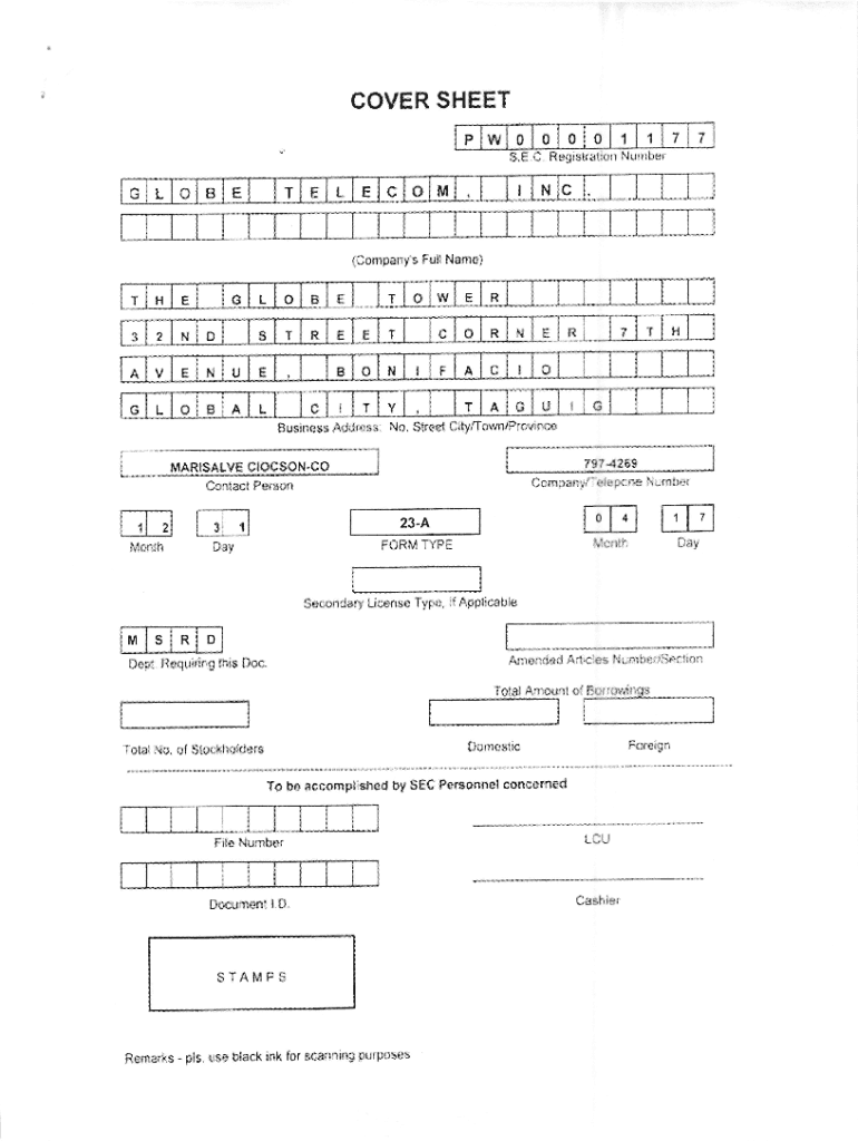 COVER SHEET FL,oLTfrBEL0ETUwI00IHfl0,l177Cornpeny “s Full Name) GTO wERETcoRNEBoNFAcIoITYTAuULoBESTRETHE32NDAVENuEGL0B,LC Fusing** Address:IInI7S7 Sober4269panyrTelrpcfi s 4071illonthF$RM TYPE0er×Monihrn23AIN