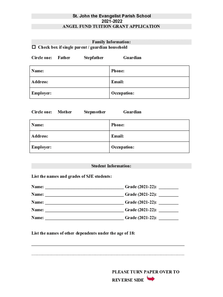 St. John the Evangelist Parish School 20212022 ANGEL FUND TUITION GRANT APPLICATION Family Information: Check box if single parent / guardian household Circle one:FatherStepfatherGuardianName:Phone:Address:Email:Employer:Occupation:Circle