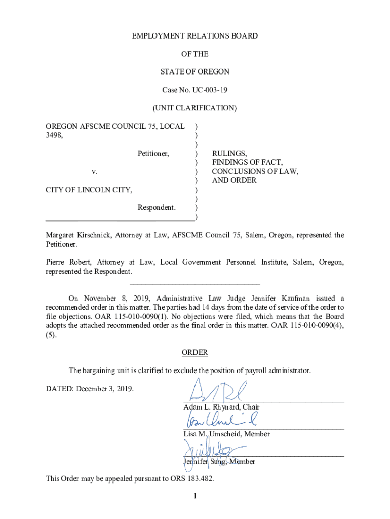 EMPLOYMENT RELATIONS BOARD OF THE STATE OF OREGON Case No. UC00319 (UNIT CLARIFICATION) OREGON AFS CME COUNCIL 75, LOCAL 3498, Petitioner, v. CITY OF LINCOLN CITY, Respondent.) ))))))))))RULINGS,