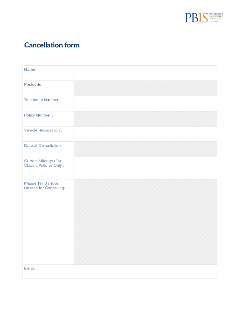 Cancellation formNamePostcodeTelephone Number:Policy Number :Vehicle Registration :Date of Cancellation:Current Mileage (For