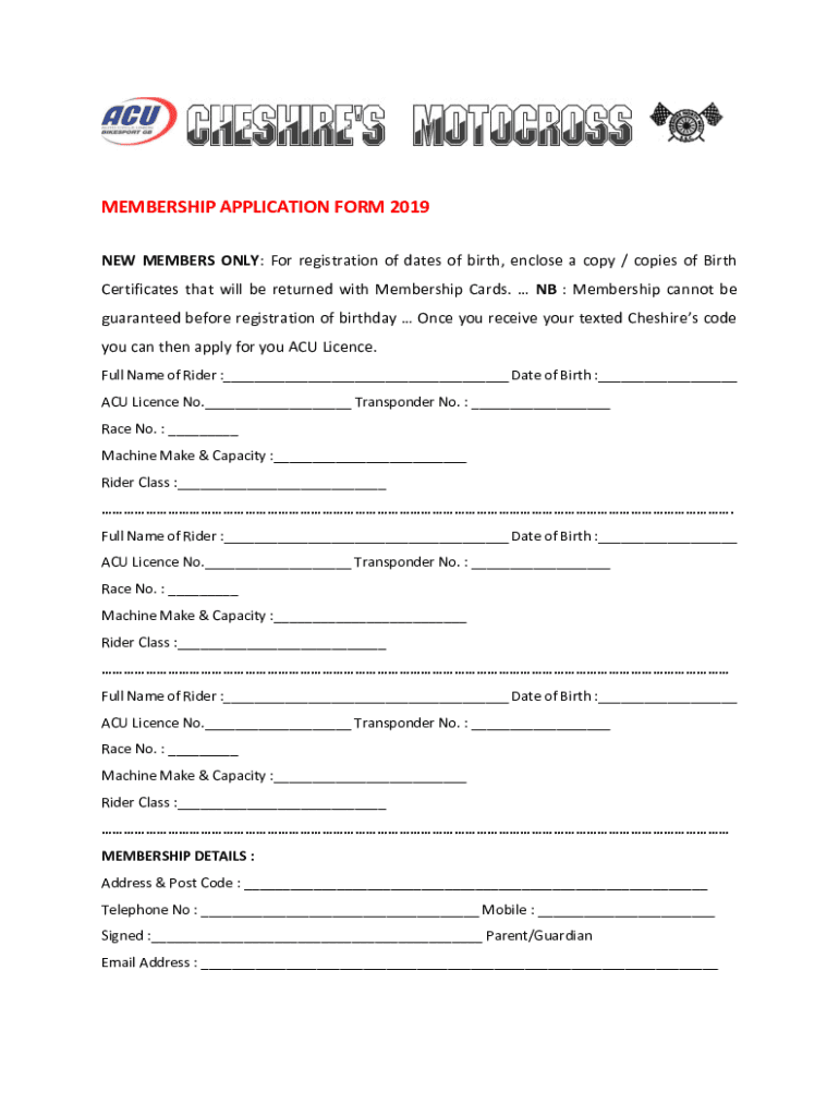 MEMBERSHIP APPLICATION FORM 2019 NEW MEMBERS ONLY: For registration of dates of birth, enclose a copy / copies of Birth Certificates that will be returned with Membership Cards. NB : Membership cannot