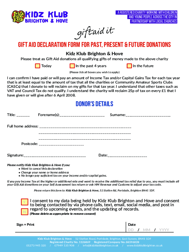 A registered charity working with children and young people across the city IN partnership with local churchesGift Aid Declaration Form for past, present & future donations Kids Club Brighton & HovePlease