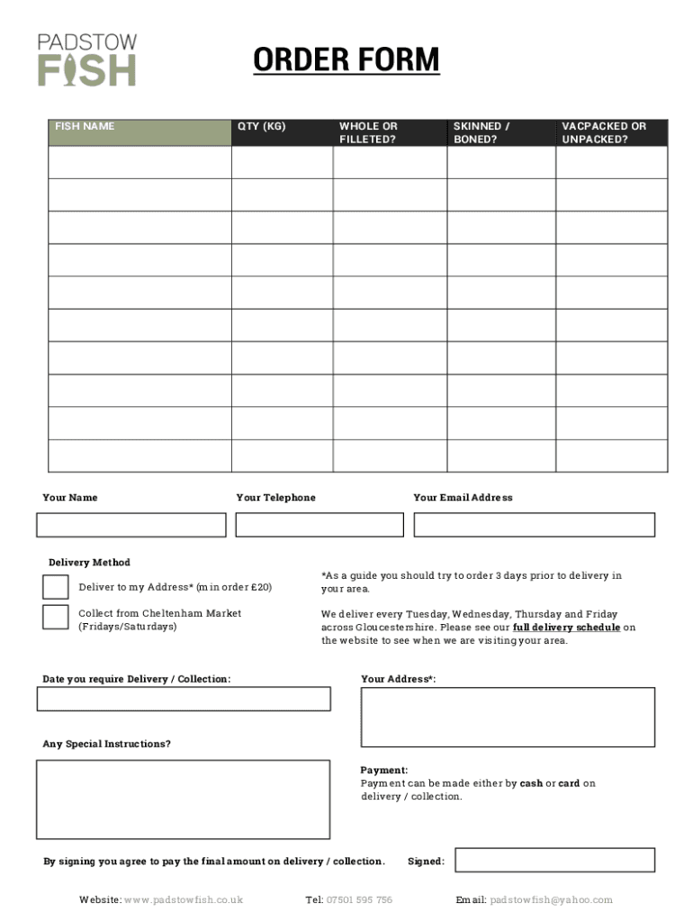 To fill out the Padstow Fish Order Form, provide your contact information, specify the type and quantity of fish desired, select the delivery date, and include any special instructions.
