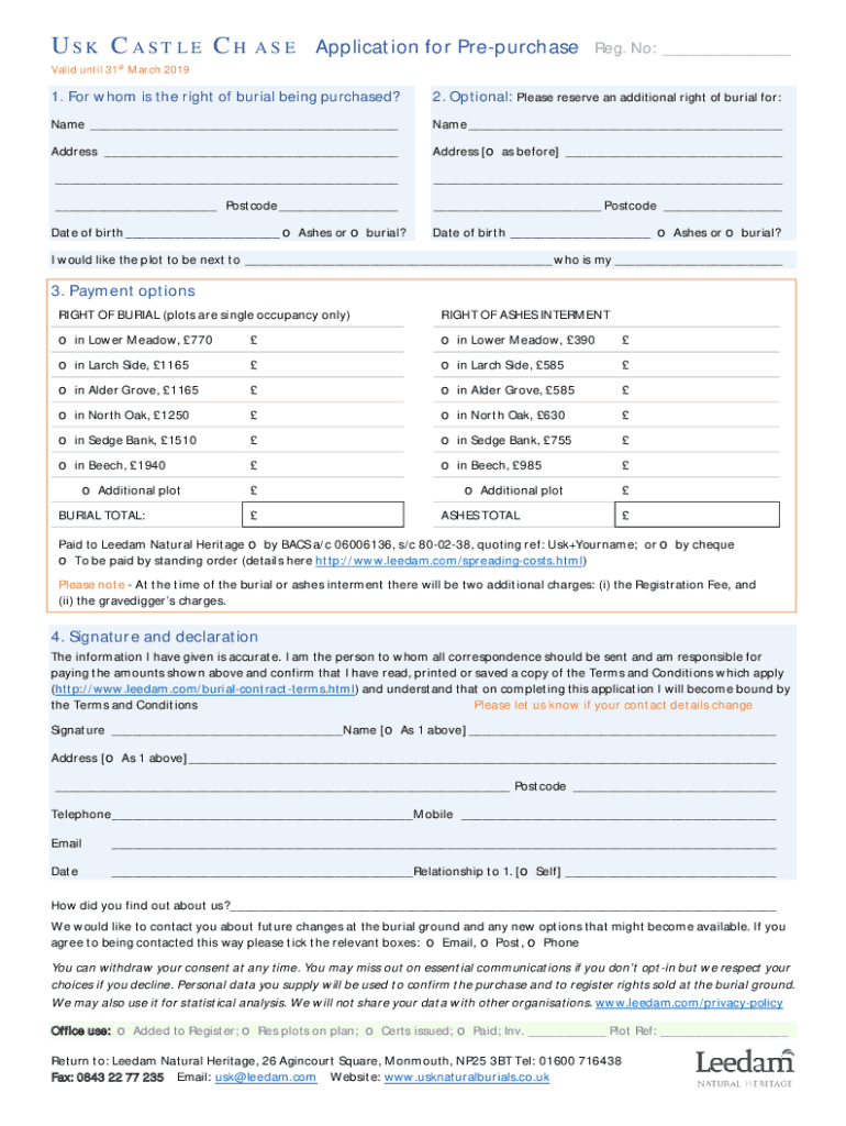 Us Castle Chase Application for Prepurchase Valid until31stReg. No: March 20191. For whom is the right of burial being purchased?2. Optional: Please reserve an additional right of burial for:Name