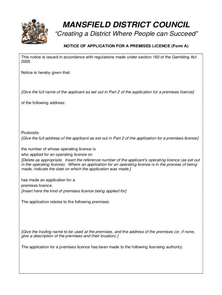 MANSFIELD DISTRICT COUNCIL Creating a District Where People can Succeed NOTICE OF APPLICATION FOR A PREMISES License (Form A) This notice is issued in accordance with regulations made under section
