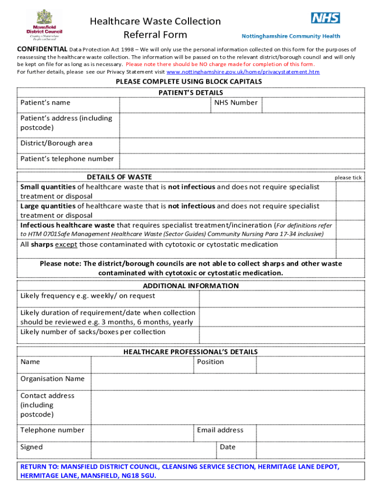 Healthcare Waste Collection Referral Form CONFIDENTIAL Data Protection Act 1998 We will only use the personal information collected on this form for the purposes of reassessing the healthcare waste