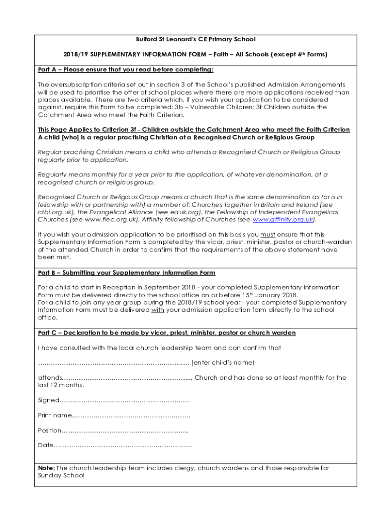 Buford St Leonard's CE Primary School2018/19 SUPPLEMENTARY INFORMATION FORM Faith All Schools (except 6th Forms) Part A Please ensure that you read before completing: The over subscription criteria