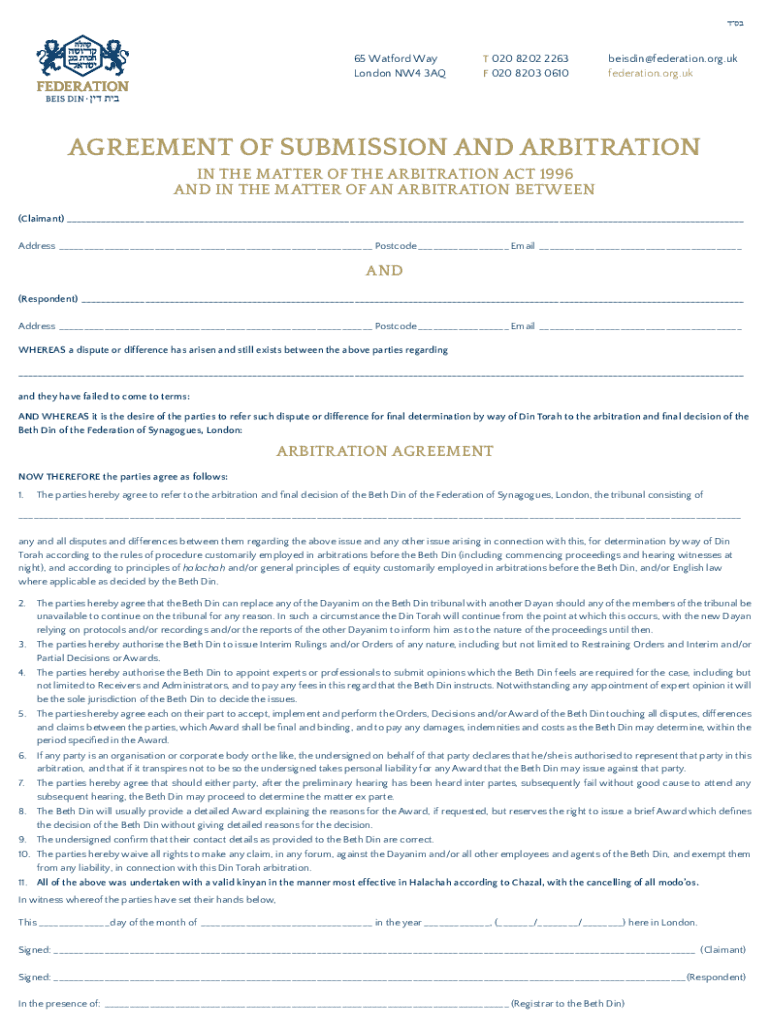 65 Watford Way London NW4 3AQT 020 8202 2263 F 020 8203 0610beisdin federation.org.UK federation.org.agreement OF SUBMISSION AND ARBITRATION IN THE MATTER OF THE ARBITRATION ACT 1996 AND IN THE MATTER