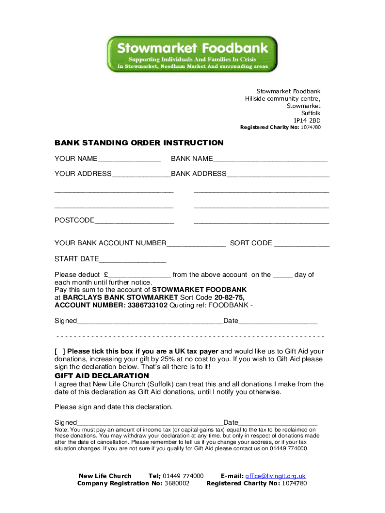 Stow market Food bank Hillside community center, Stow market Suffolk IP14 2BDRegistered Charity No: 1074780BANK STANDING ORDER INSTRUCTION YOUR NAME BANK NAME YOUR ADDRESS BANK ADDRESS POSTCODE YOUR