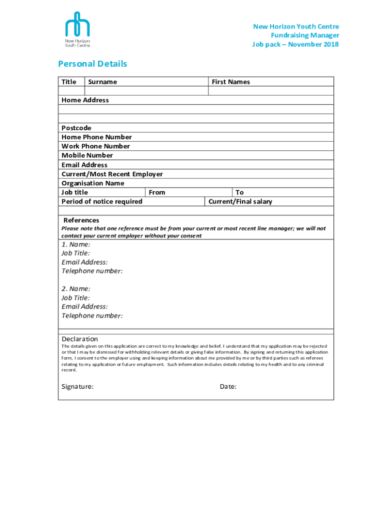 New Horizon Youth Center Fundraising Manager Job pack November 2018Personal Details TitleSurnameFirst Namesake AddressPostcode Home Phone Number Work Phone Number Mobile Number Email Address Current/Most
