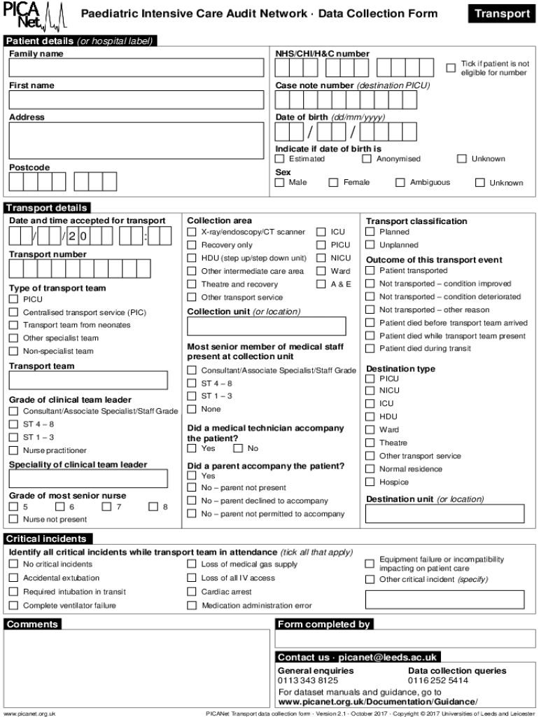 Pediatric Intensive Care Audit Network Data Collection FormTransportPatient details (or hospital label) Family name NHS/CHI/H&C number Tick if patient is not eligible for numberFirst name Case note