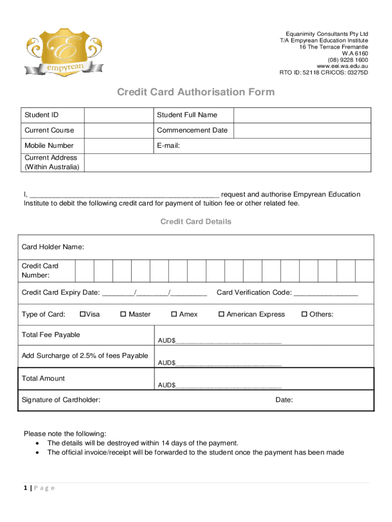 Equanimity Consultants Pty Ltd T/A Empyrean Education Institute 16 The Terrace Fremantle W. A 6160 (08) 9228 1600 www.eei.wa.edu.au RTO ID: 52118 CRICKS: 03275DCredit Card Authorization Form Student