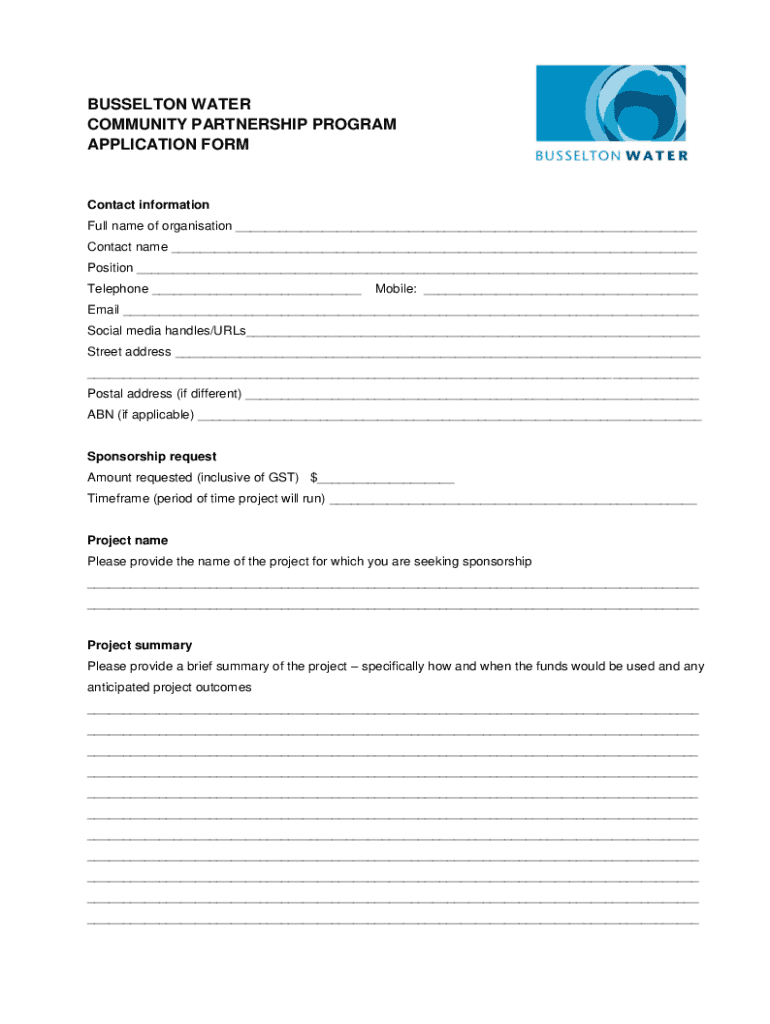 To fill out the Busselton Water Community Partnership application, interested parties should complete the required forms available on the Busselton Water website, providing relevant details about their community projects and objectives.
