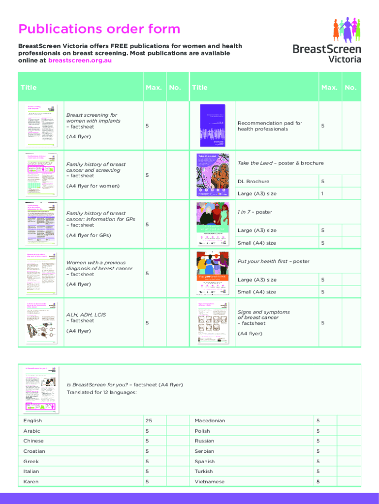 Get the free Publications order form - BreastScreenHomeMy BreastScreenIs breast screening the rig...
