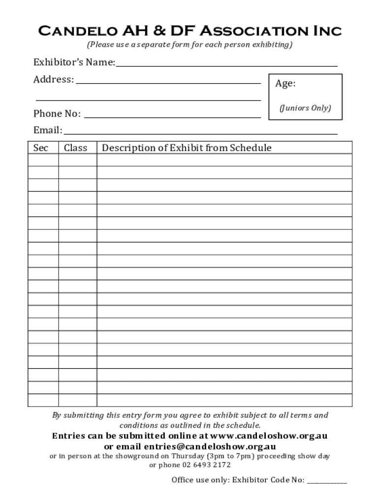Candela AH & OF Association Inc (Please use a separate form for each person exhibiting)Exhibitors Name: Address: Age: Phone No: (Juniors Only)Email: SecClassDescription of Exhibit from Scheduled submitting