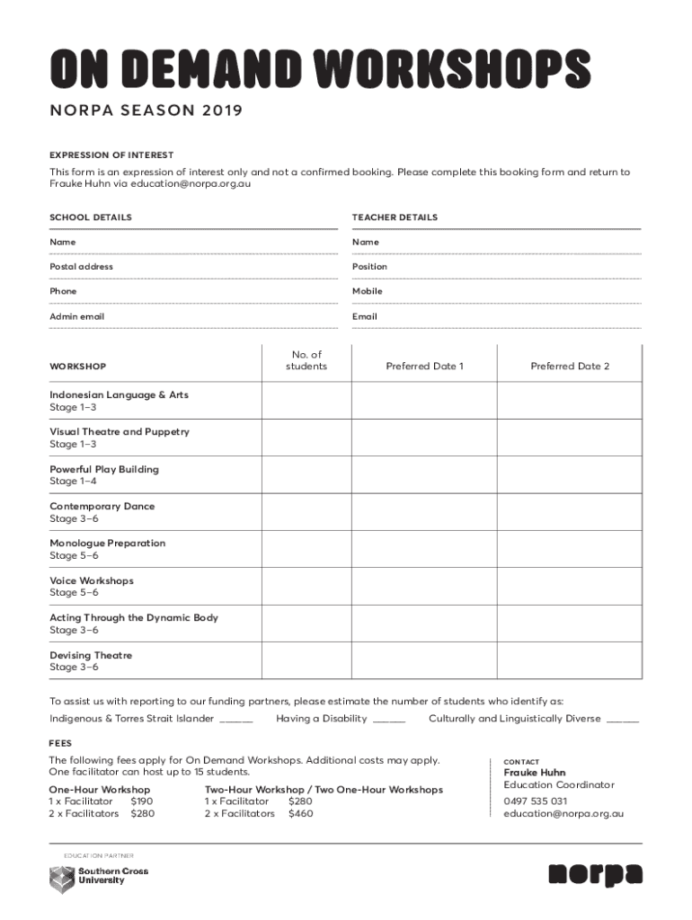 ON DEMAND WORKSHOPS NO RPA S EAS O N 2 019 EXPRESSION OF Interests form is an expression of interest only and not a confirmed booking. Please complete this booking form and return to France Hahn via