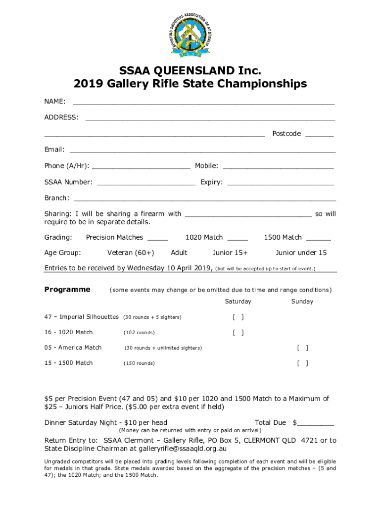 SSA QUEENSLAND Inc. 2019 Gallery Rifle State Championships NAME: ADDRESS: Postcode Email: Phone (A/Hr): Mobile: SSA Number: Expiry: Branch: Sharing: I will be sharing a firearm with so will require