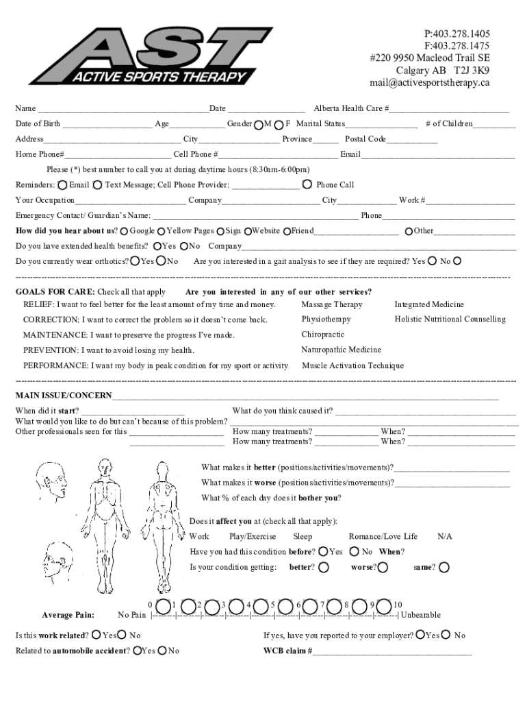 P:403.278.1405 F:403.278.1475 #220 9950 MacLeod Trail SE Calgary AB T2J 3K9 mail activesportstherapy.ca Name Date Alberta Health Care # Date of Birth Age Gender M F Marital Status # of Children Address