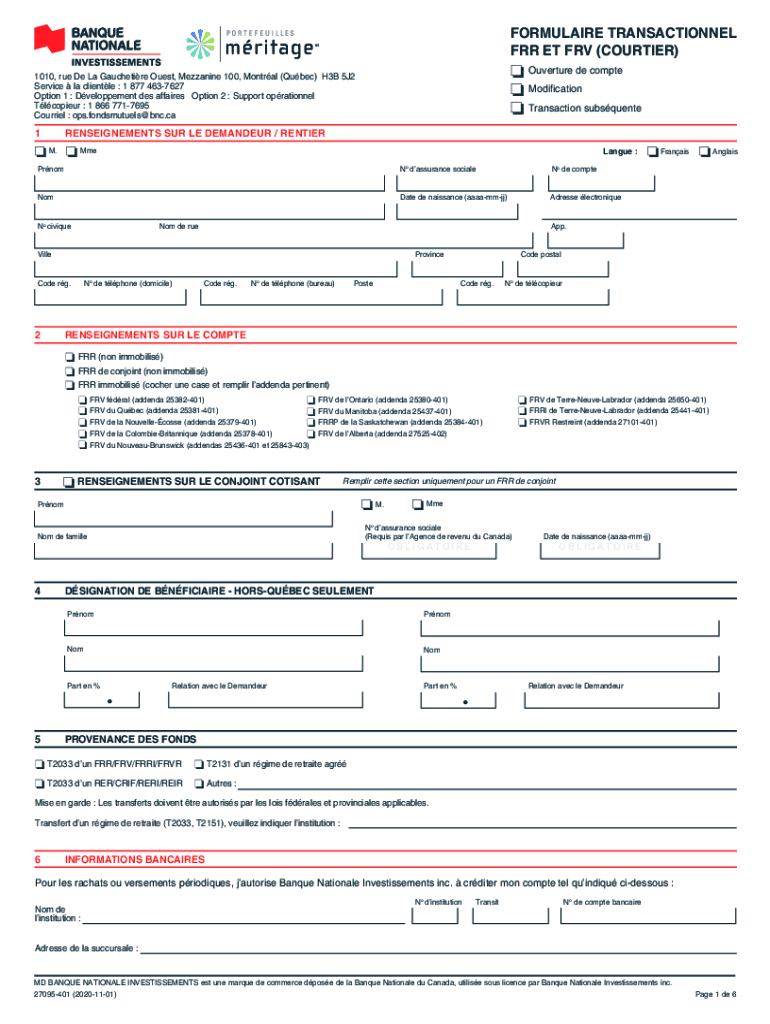FORMULA IRE TRANSACTIONAL FRR ET FRS (COURTIER)Ouverture de compete Modification Transaction subsquente1010, rue De La Gauche tire Guest, Mezzanine100, Montreal (Quebec) H3B5J2 Service la clientele: