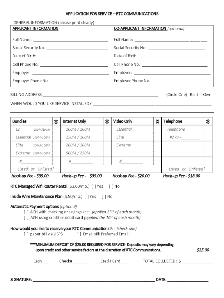 APPLICATION FOR SERVICE RTC COMMUNICATIONS GENERAL INFORMATION (please print clearly) APPLICANT INFORMATIONCOAPPLICANT INFORMATION (optional)Full Name: Full Name: Social Security No. Social Security