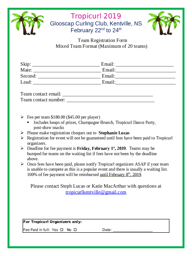 Tropical 2019 Foolscap Curling Club, Kerrville, NS February 22nd to 24th Team Registration Form Mixed Team Format (Maximum of 20 teams) Skip: Email: Mate: Email: Second: Email: Lead: Email: Team contact