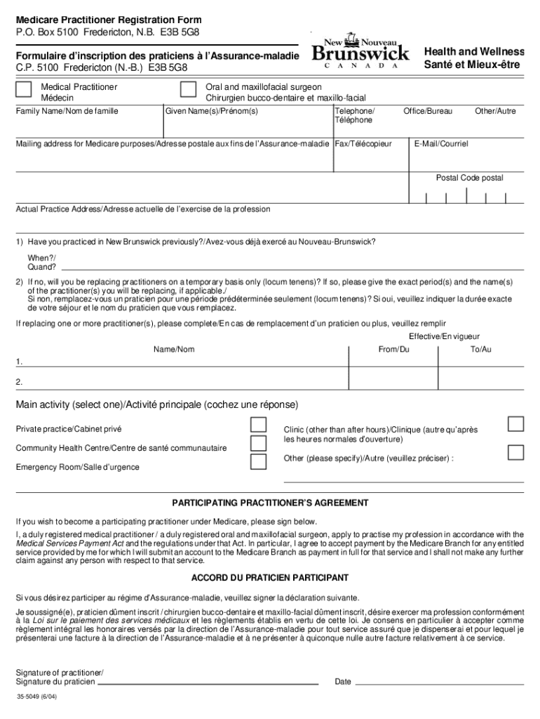 Medicare Practitioner Registration Form P.O. Box 5100 Fredericton, N.B. E3B 5G8Health and Wellness Sent et MieuxtreFormulaire inscription DES practicians lAssurancemaladie C.P. 5100 Fredericton (N.B.)