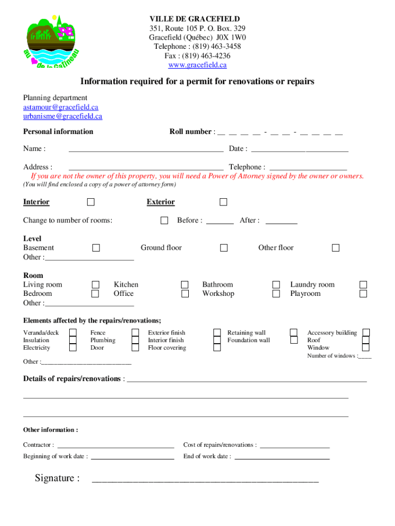 VILLA DE GARFIELD 351, Route 105 P. O. Box. 329 Grace field (Quebec) J0X 1W0 Telephone : (819) 4633458 Fax : (819) 4634236 www.gracefield.caInformation required for a permit for renovations or repairs