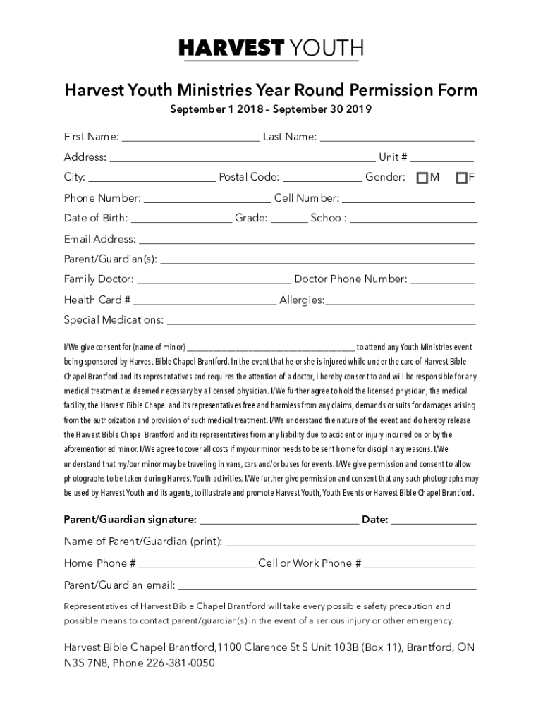 HARVEST YOUTH Ministries Year Round Permission Form September 1, 2018, September 30, 2019, First Name: Last Name: Address: Unit # City: Postal Code: Gender:MFP hone Number: Cell Number: Date of Birth: