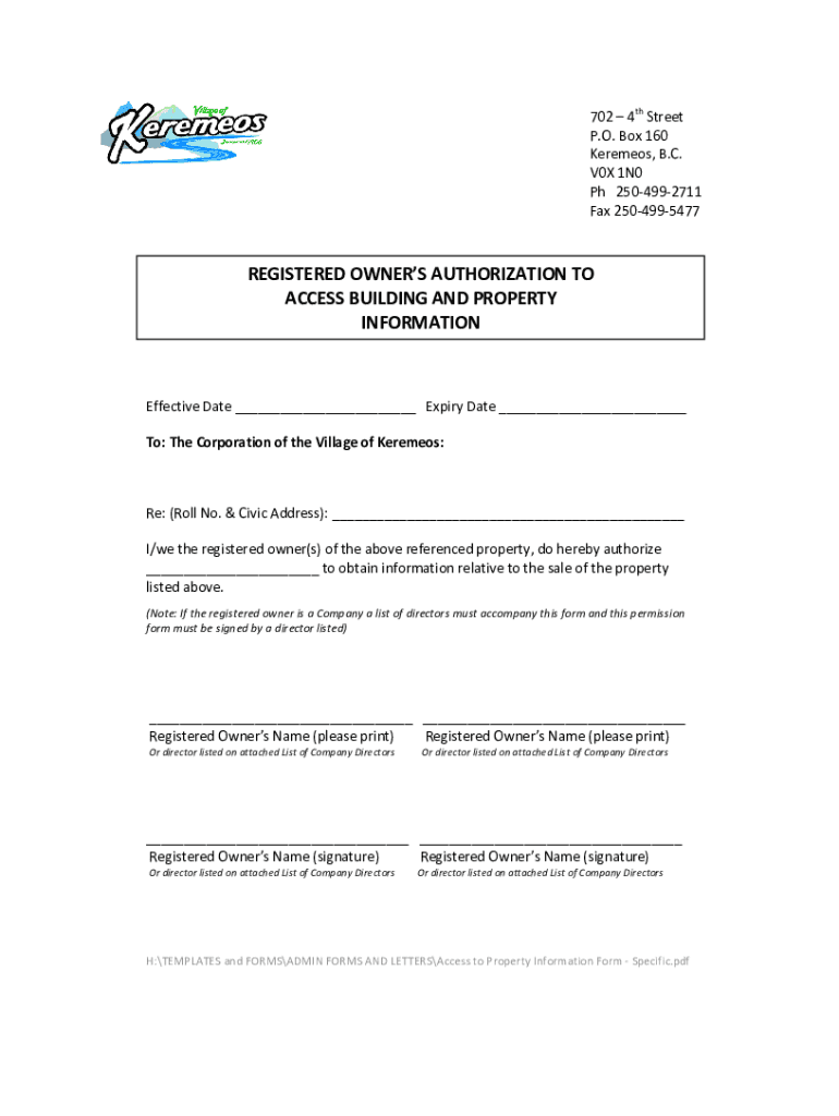 702 4th Street P.O. Box 160 Farmers, B.C. V0X 1N0 pH 2504992711 Fax 2504995477REGISTERED OWNERS AUTHORIZATION TO ACCESS BUILDING AND PROPERTY INFORMATIONEffective Date Expiry Date To: The Corporation