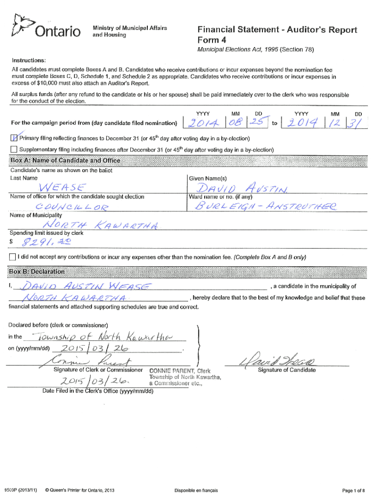 'OfttariOlill 'it “J, “iunicipatArrairs Financial statement Auditor's Report Form 4Municipal Elections Act, 1996 (Section 78) instructions: All candidates must complete Boxes A and B. Candidates