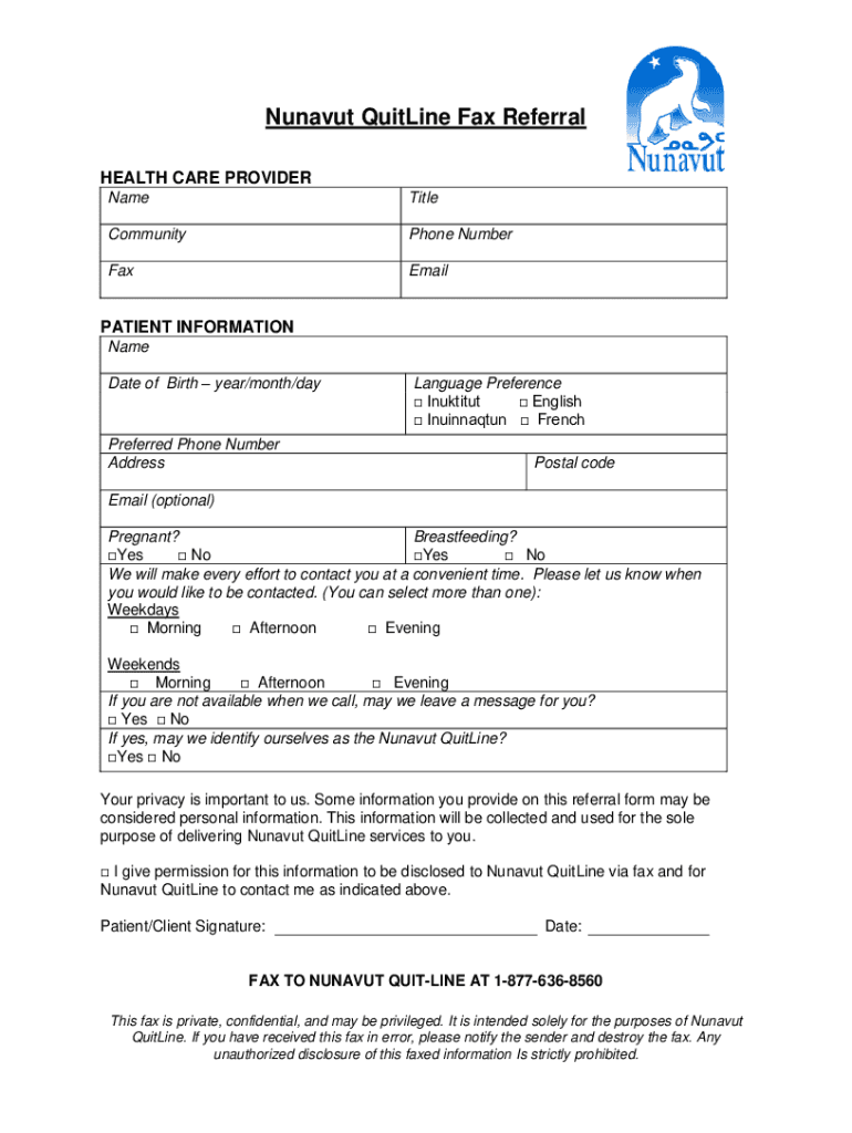 Nunavut Outline Fax Referral HEALTH CARE PROVIDER NameTitleCommunityPhone NumberFaxEmailPATIENT INFORMATION Name Date of Birth year/month/preferred Phone Number AddressLanguage Preference Inuktitut