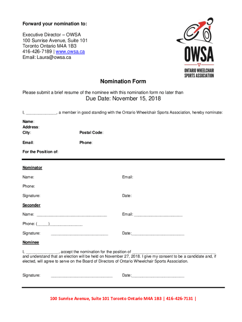 Forward your nomination to: Executive Director OHSA 100 Sunrise Avenue, Suite 101 Toronto Ontario M4A 1B3 4164267189 www.owsa.ca Email: Laura OHSA.nomination Form Please submit a brief resume of the