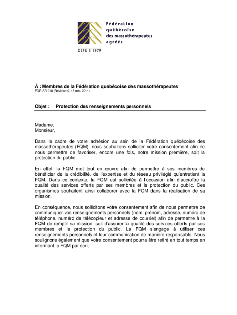 Members DE la Formation Quebecoise DES massothrapeutes FORAY 010 (Vision 0, 18 Nov. 2014)Object :Protection DES restatements personnelsMadame, Monsieur, Dan's LE cadre DE vote adhesion AU San de la
