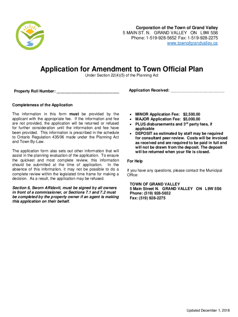Corporation of the Town of Grand Valley 5 MAIN ST. N. GRAND VALLEY ON L9W 5S6 Phone: 15199285652 Fax: 15199282275 www.townofgrandvalley.caApplication for Amendment to Town Official Plan Under Section